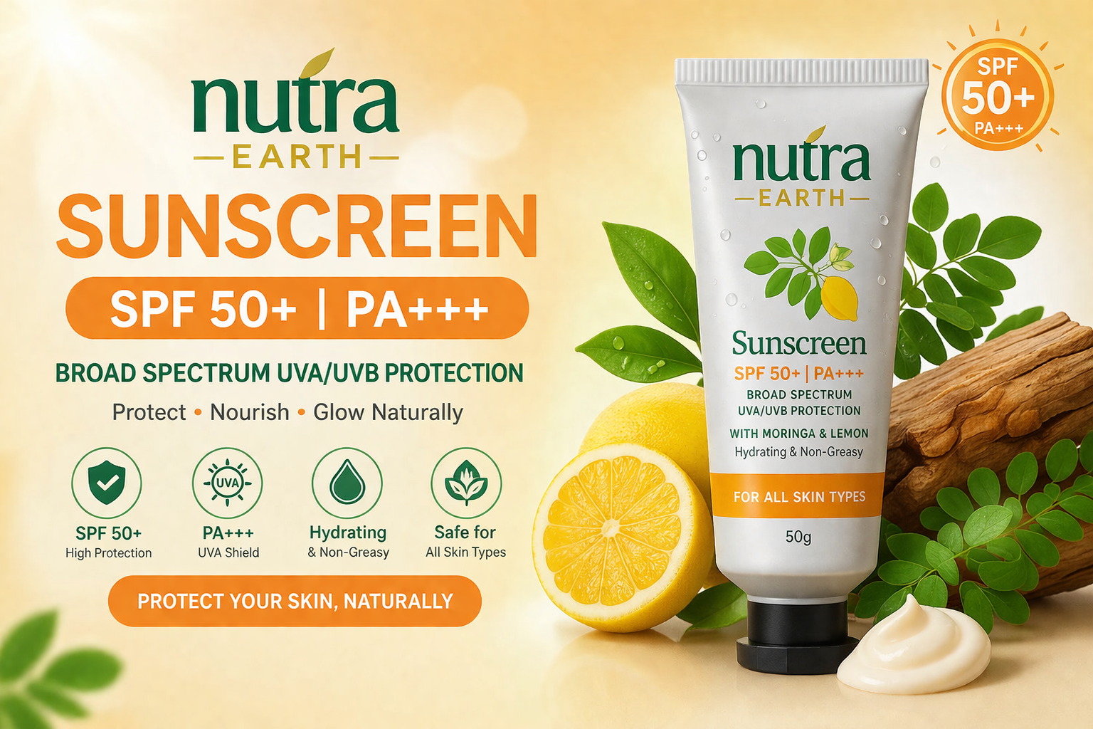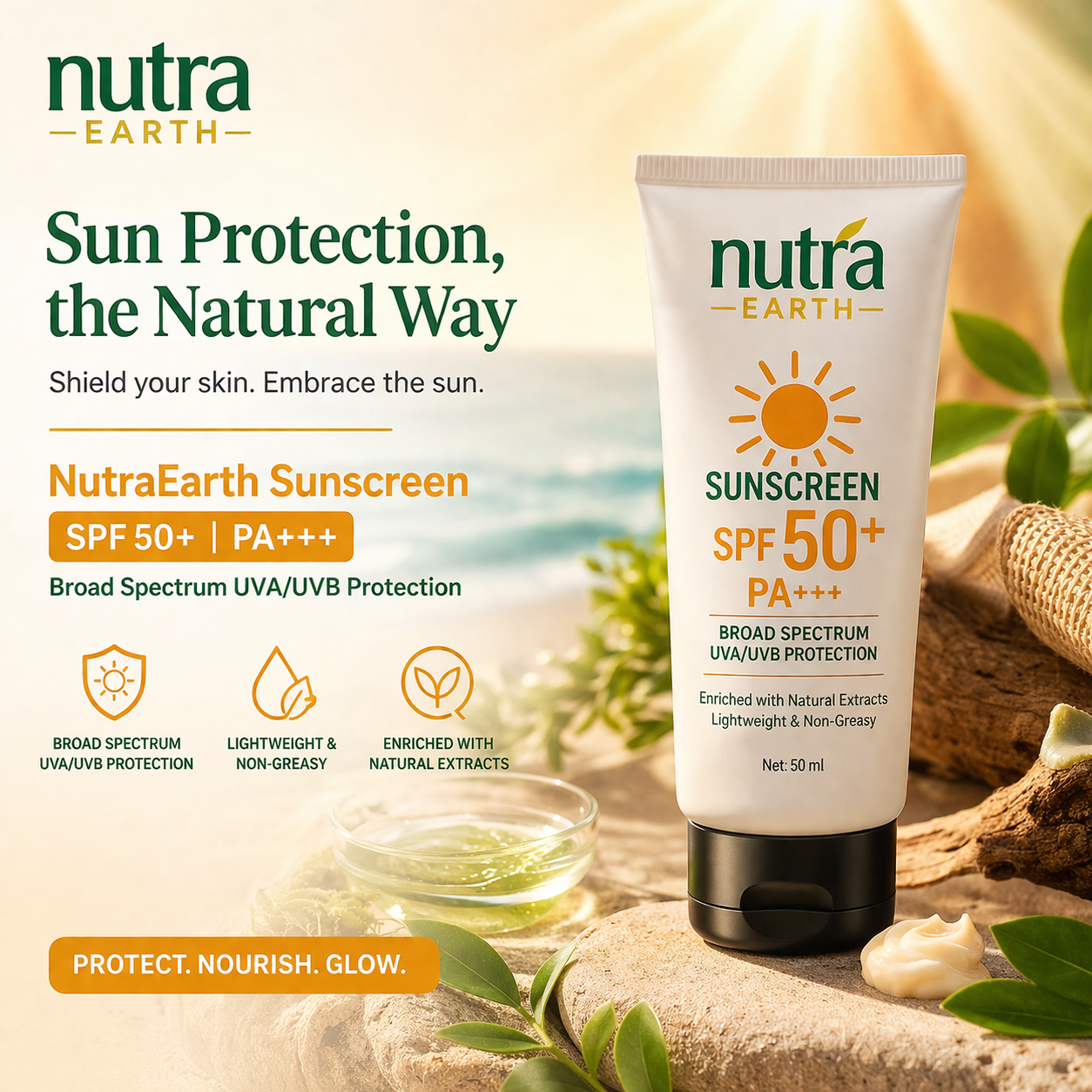 Protect your skin every day with NutraEarth Sunscreen SPF 50+ PA+++, designed to shield against harmful UVA & UVB rays while keeping your skin fresh and oil-free.